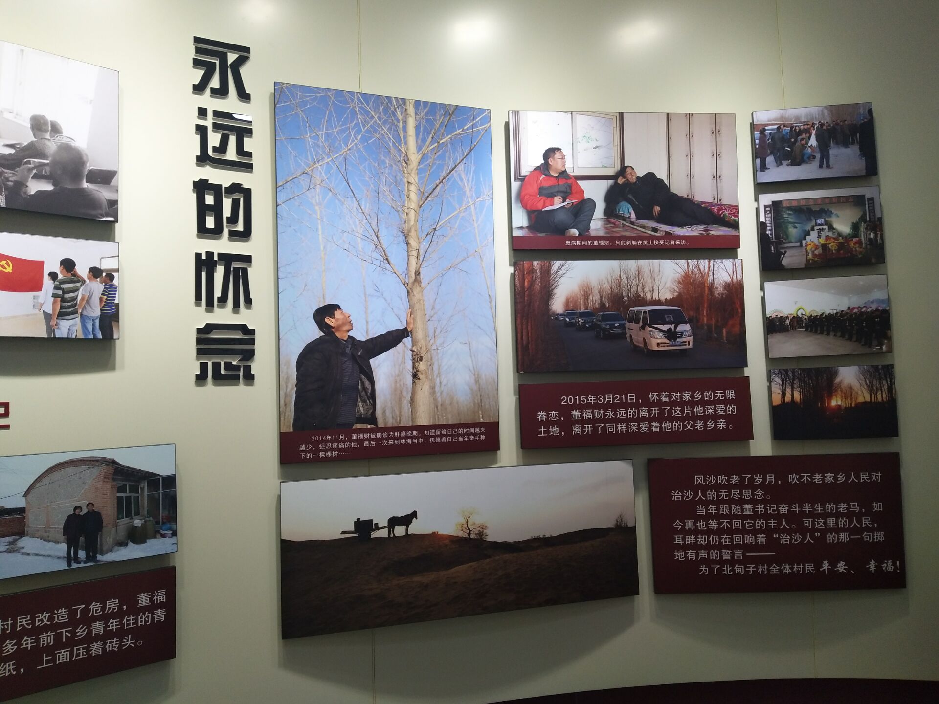 党员在讲解员的带领下参观了董福财先进事迹陈列馆。董福财同志用尽毕生精力,带领全村村民努力奋斗,使北甸子村实现了“治沙梦、筑路梦、致富梦”。这一切,感动着每一位党员教师,大家钦佩这位基层党员的高尚情操。董福财的人生追求,给人思想上的震撼,特别是他牢记宗旨、造福于民的博大情怀,在党员中引起强烈的共鸣。