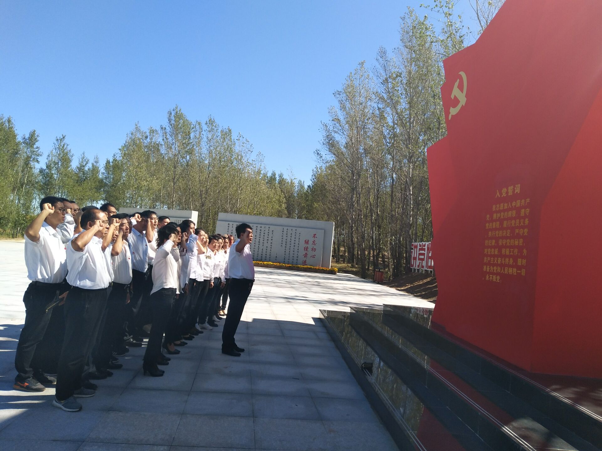 随后,全体党员观看了辽宁好人榜《董福财先进事迹》的视频,实地参观了“希望林”、“福财路”,亲身体验了北甸子村的村况、村貌。党员们重走荒漠沙土路,体验行走的艰辛,感受董福财带领村民植树治沙的岁月。大家在表率林举起右手,重温入党誓词。这是对党的再次宣誓,也是对自己肩负党员责任的郑重承诺。