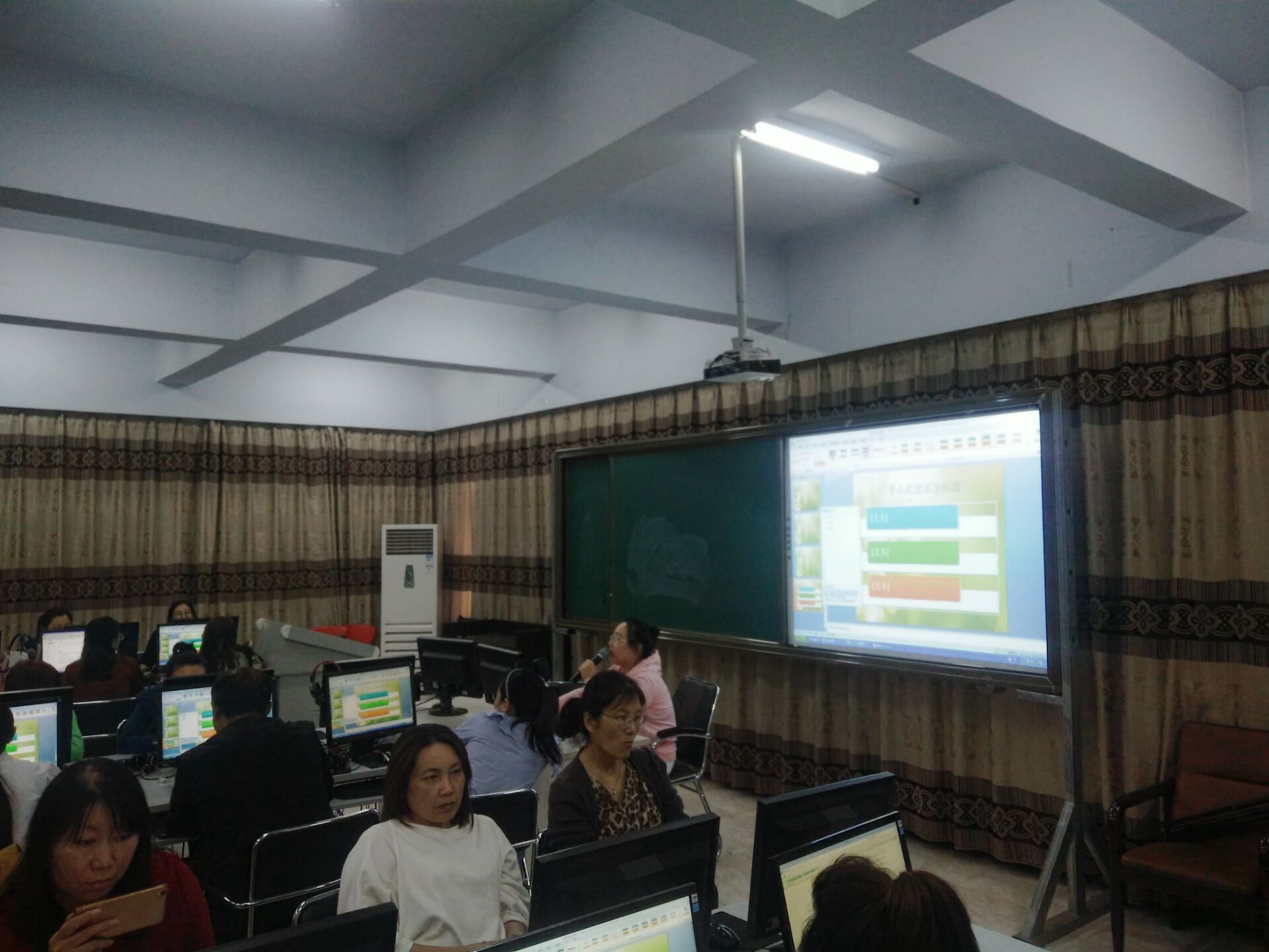 在总结前两次录制的经验后,为了能够再次提高本次微课录制的质量,我县于2017年9月26日请市电教馆教研部张瑛主任、杨冬颖老师与赵明辉老师来我县进行培训。全县23所九年制学校与县内2所小学分别派优秀教师与技术人员参与此次培训。教师进修学校全体学科教研员也参加了此次培训。