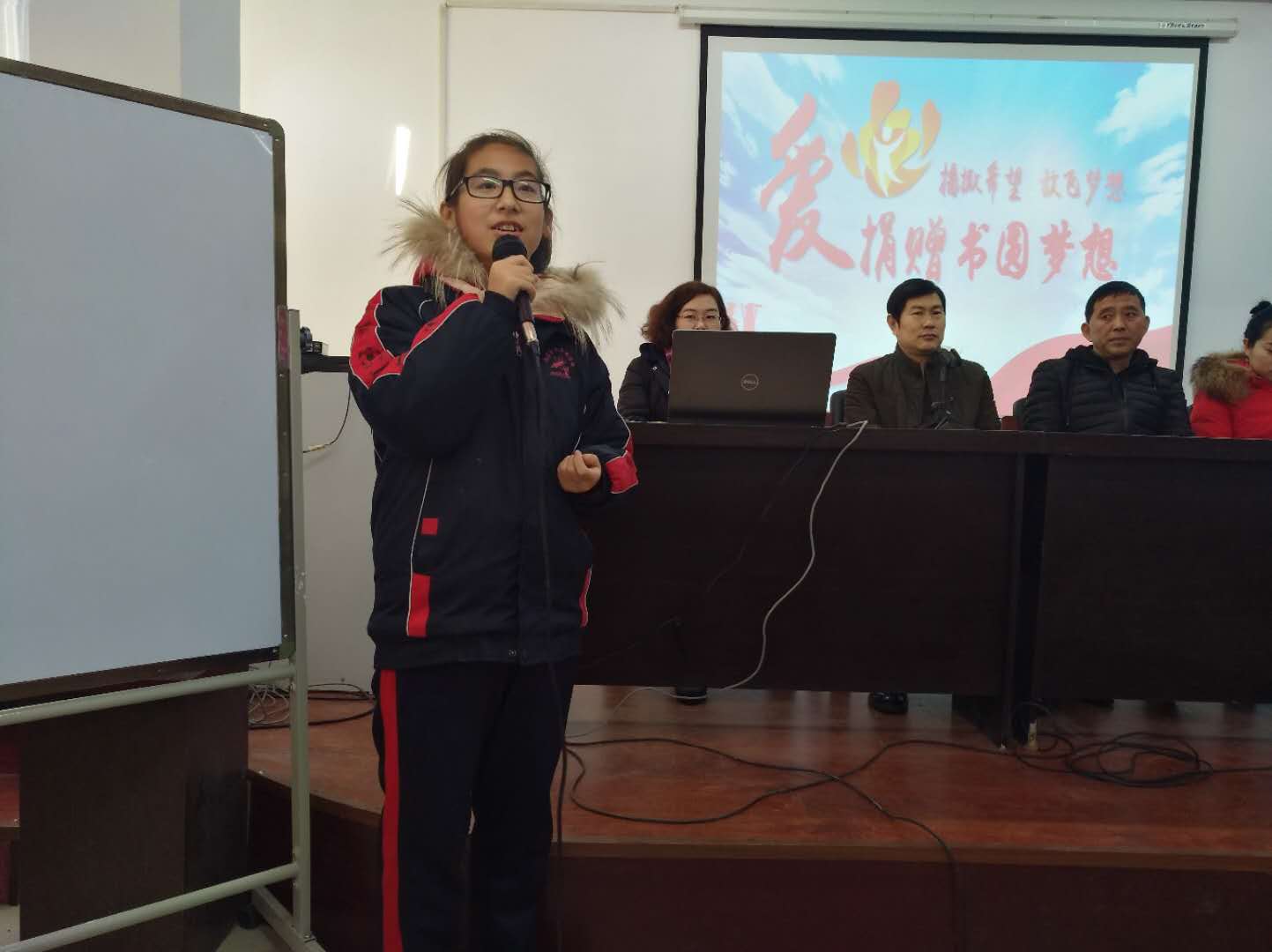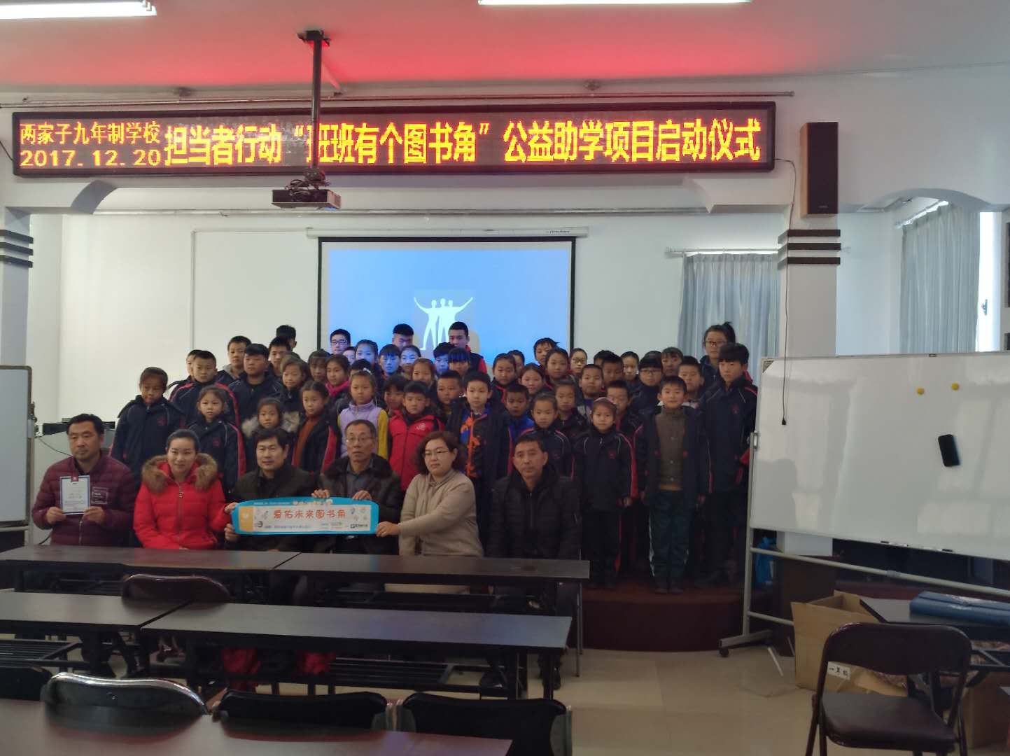 2017年12月20日,担当者全国公益性组织东北分部的负责人来到两家子九年制学校,举行了担当者行动“班班有个图书角”公益助学项目启动仪式。仪式上志愿者张杨为老师和同学们讲了担当者行动发展历程及目的、意义,两家子九年制学校冮焱军校长致欢迎词,学生代表也表达了他们的心声。