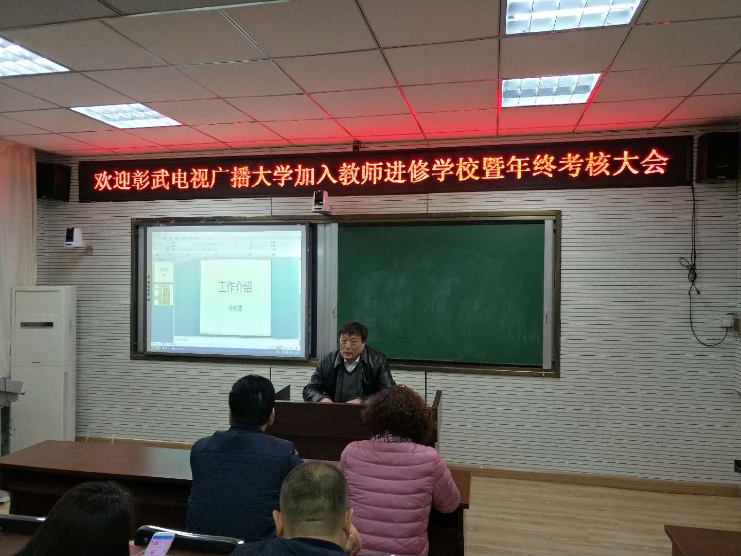 辛立东副校长主持欢迎彰武电视广播大学加入教师进修学校会议 尹晓华书记对电大加入教师进修学校致欢迎辞 李小侠校长对电大工作进行汇报 宫理校长做重要讲话 教师进修学校全体教师参加会议 (照片编辑:顾戬) 2017年12月25日,在彰武县教师进修学校二楼召开“欢迎彰武电视广播大学加入教师进修学校暨年终考核大会”,会议由教师进修学校副校长辛立东主持,会上尹晓华书记致欢迎辞,原电大副校长李小侠对电大回归教育,加入彰武教师进修学校做重要讲话,并对电大的发展与工作情况进行详细汇报,电大教师王冰梅、王晓丽、孙浩莹、张立秋、徐柏惠分别进行了自我介绍与工作汇报,教师进修学校宫理校长进行总结,同时强调对电大加入的后续工作要逐渐完善、各部门要互相协作。